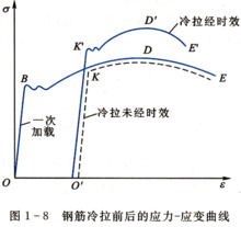 取一钢筋对其施加拉应力冷拉,钢筋会发生变形(并作应力——应变图)。随着拉应力增加,钢筋内部承受的拉应力逐渐增大。当钢筋内部产生的拉应力超过钢筋具有的屈服点A,而达到C后,停止冷拉,卸去荷载。此时可以看到,钢筋已产生塑性变形,在卸荷过程中,应力——应变图有一个变化,直线O1C比直线OA要缓。